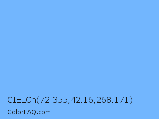 CIELCh 72.355,42.16,268.171 Color is a light blue color and the nearest color is French Sky Blue #77b5fe. Hex code #72b6fe and RGB value is rgb(114,182,254). In RGB color space, this color is composed of 45% red, 71% green, 100% blue, In CMYK color space, this color is composed of 55% cyan, 28% magenta, 0% yellow , 0% black , In HSL color space, this color has a hue angle of 211° , 99% saturation and 72% lightness.