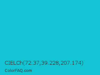 CIELCh 72.37,39.228,207.174 Color is a normal cyan color and the nearest color is Turquoise Surf #00c5cd. Hex code #12c4d1 and RGB value is rgb(18,196,209). In RGB color space, this color is composed of 7% red, 77% green, 82% blue, In CMYK color space, this color is composed of 91% cyan, 6% magenta, 0% yellow , 18% black , In HSL color space, this color has a hue angle of 184° , 84% saturation and 45% lightness.