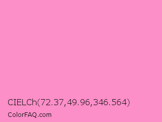 CIELCh 72.37,49.96,346.564 Color is a light rose color and the nearest color is Princess Perfume #ff85cf. Hex code #fc8ec8 and RGB value is rgb(252,142,200). In RGB color space, this color is composed of 99% red, 56% green, 78% blue, In CMYK color space, this color is composed of 0% cyan, 44% magenta, 21% yellow , 1% black , In HSL color space, this color has a hue angle of 328° , 95% saturation and 77% lightness.