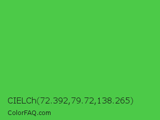 CIELCh 72.392,79.72,138.265 Color is a normal green color and the nearest color is Lime Green #32cd32. Hex code #4cca48 and RGB value is rgb(76,202,72). In RGB color space, this color is composed of 30% red, 79% green, 28% blue, In CMYK color space, this color is composed of 62% cyan, 0% magenta, 64% yellow , 21% black , In HSL color space, this color has a hue angle of 118° , 55% saturation and 54% lightness.