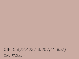 CIELCh 72.423,13.207,41.857 Color is a light red color and the nearest color is Rodeo Dust #c9b29b. Hex code #caaba2 and RGB value is rgb(202,171,162). In RGB color space, this color is composed of 79% red, 67% green, 64% blue, In CMYK color space, this color is composed of 0% cyan, 15% magenta, 20% yellow , 21% black , In HSL color space, this color has a hue angle of 14° , 27% saturation and 71% lightness.