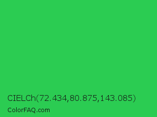 CIELCh 72.434,80.875,143.085 Color is a normal green color and the nearest color is Lime Green #32cd32. Hex code #2bcc52 and RGB value is rgb(43,204,82). In RGB color space, this color is composed of 17% red, 80% green, 32% blue, In CMYK color space, this color is composed of 79% cyan, 0% magenta, 60% yellow , 20% black , In HSL color space, this color has a hue angle of 135° , 65% saturation and 48% lightness.
