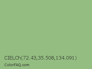 CIELCh 72.43,35.508,134.091 Color is a light green color and the nearest color is Dark Sea Green #8fbc8f. Hex code #94bd82 and RGB value is rgb(148,189,130). In RGB color space, this color is composed of 58% red, 74% green, 51% blue, In CMYK color space, this color is composed of 22% cyan, 0% magenta, 31% yellow , 26% black , In HSL color space, this color has a hue angle of 102° , 31% saturation and 63% lightness.