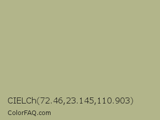 CIELCh 72.46,23.145,110.903 Color is a light yellow color and the nearest color is Swamp Green #acb78e. Hex code #b2b58a and RGB value is rgb(178,181,138). In RGB color space, this color is composed of 70% red, 71% green, 54% blue, In CMYK color space, this color is composed of 2% cyan, 0% magenta, 24% yellow , 29% black , In HSL color space, this color has a hue angle of 64° , 23% saturation and 63% lightness.