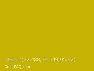 CIELCh 72.488,74.549,95.92 Color is a normal yellow color and the nearest color is Buddha Gold #c1a004. Hex code #c7b303 and RGB value is rgb(199,179,3). In RGB color space, this color is composed of 78% red, 70% green, 1% blue, In CMYK color space, this color is composed of 0% cyan, 10% magenta, 98% yellow , 22% black , In HSL color space, this color has a hue angle of 54° , 97% saturation and 40% lightness.