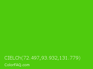 CIELCh 72.497,93.932,131.779 Color is a normal green color and the nearest color is Harlequin Green #46cb18. Hex code #4fcb0d and RGB value is rgb(79,203,13). In RGB color space, this color is composed of 31% red, 80% green, 5% blue, In CMYK color space, this color is composed of 61% cyan, 0% magenta, 94% yellow , 20% black , In HSL color space, this color has a hue angle of 99° , 88% saturation and 42% lightness.