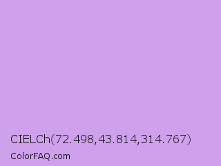 CIELCh 72.498,43.814,314.767 Color is a light purple color and the nearest color is Bright Ube #d19fe8. Hex code #cfa0eb and RGB value is rgb(207,160,235). In RGB color space, this color is composed of 81% red, 63% green, 92% blue, In CMYK color space, this color is composed of 12% cyan, 32% magenta, 0% yellow , 8% black , In HSL color space, this color has a hue angle of 278° , 65% saturation and 77% lightness.