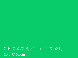 CIELCh 72.4,74.151,149.581 Color is a normal green color and the nearest color is Malachite #0bda51. Hex code #08cc69 and RGB value is rgb(8,204,105). In RGB color space, this color is composed of 3% red, 80% green, 41% blue, In CMYK color space, this color is composed of 96% cyan, 0% magenta, 49% yellow , 20% black , In HSL color space, this color has a hue angle of 150° , 92% saturation and 42% lightness.