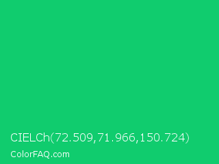 CIELCh 72.509,71.966,150.724 Color is a normal green color and the nearest color is Malachite #0bda51. Hex code #10cc6e and RGB value is rgb(16,204,110). In RGB color space, this color is composed of 6% red, 80% green, 43% blue, In CMYK color space, this color is composed of 92% cyan, 0% magenta, 46% yellow , 20% black , In HSL color space, this color has a hue angle of 150° , 85% saturation and 43% lightness.