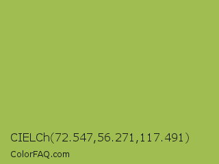 CIELCh 72.547,56.271,117.491 Color is a normal lime color and the nearest color is Middle Green Yellow #acbf60. Hex code #a0bd52 and RGB value is rgb(160,189,82). In RGB color space, this color is composed of 63% red, 74% green, 32% blue, In CMYK color space, this color is composed of 15% cyan, 0% magenta, 57% yellow , 26% black , In HSL color space, this color has a hue angle of 76° , 45% saturation and 53% lightness.