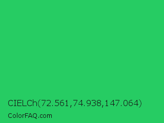 CIELCh 72.561,74.938,147.064 Color is a normal green color and the nearest color is UFO Green #3cd070. Hex code #26cc63 and RGB value is rgb(38,204,99). In RGB color space, this color is composed of 15% red, 80% green, 39% blue, In CMYK color space, this color is composed of 81% cyan, 0% magenta, 51% yellow , 20% black , In HSL color space, this color has a hue angle of 142° , 69% saturation and 47% lightness.