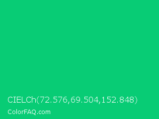 CIELCh 72.576,69.504,152.848 Color is a normal green color and the nearest color is Mountain Meadow Crayola #1ab385. Hex code #08cc75 and RGB value is rgb(8,204,117). In RGB color space, this color is composed of 3% red, 80% green, 46% blue, In CMYK color space, this color is composed of 96% cyan, 0% magenta, 43% yellow , 20% black , In HSL color space, this color has a hue angle of 153° , 92% saturation and 42% lightness.