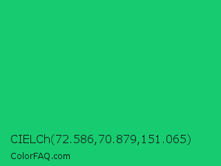 CIELCh 72.586,70.879,151.065 Color is a normal green color and the nearest color is Mountain Meadow Crayola #1ab385. Hex code #17cc70 and RGB value is rgb(23,204,112). In RGB color space, this color is composed of 9% red, 80% green, 44% blue, In CMYK color space, this color is composed of 89% cyan, 0% magenta, 45% yellow , 20% black , In HSL color space, this color has a hue angle of 150° , 80% saturation and 45% lightness.