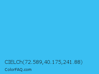 CIELCh 72.589,40.175,241.88 Color is a normal blue color and the nearest color is Picton Blue #45b1e8. Hex code #39bff2 and RGB value is rgb(57,191,242). In RGB color space, this color is composed of 22% red, 75% green, 95% blue, In CMYK color space, this color is composed of 76% cyan, 21% magenta, 0% yellow , 5% black , In HSL color space, this color has a hue angle of 197° , 88% saturation and 59% lightness.