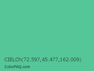 CIELCh 72.597,45.477,162.009 Color is a normal green color and the nearest color is Ocean Green #48bf91. Hex code #55c697 and RGB value is rgb(85,198,151). In RGB color space, this color is composed of 33% red, 78% green, 59% blue, In CMYK color space, this color is composed of 57% cyan, 0% magenta, 24% yellow , 22% black , In HSL color space, this color has a hue angle of 155° , 50% saturation and 55% lightness.