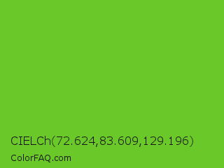 CIELCh 72.624,83.609,129.196 Color is a normal green color and the nearest color is Lima #76bd17. Hex code #6bc829 and RGB value is rgb(107,200,41). In RGB color space, this color is composed of 42% red, 78% green, 16% blue, In CMYK color space, this color is composed of 47% cyan, 0% magenta, 80% yellow , 22% black , In HSL color space, this color has a hue angle of 95° , 66% saturation and 47% lightness.