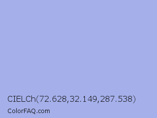 CIELCh 72.628,32.149,287.538 Color is a light blue color and the nearest color is Maximum Blue Purple #acace6. Hex code #a5afea and RGB value is rgb(165,175,234). In RGB color space, this color is composed of 65% red, 69% green, 92% blue, In CMYK color space, this color is composed of 29% cyan, 25% magenta, 0% yellow , 8% black , In HSL color space, this color has a hue angle of 231° , 62% saturation and 78% lightness.