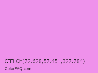 CIELCh 72.628,57.451,327.784 Color is a light magenta color and the nearest color is Lavender Magenta #ee82ee. Hex code #ef91eb and RGB value is rgb(239,145,235). In RGB color space, this color is composed of 94% red, 57% green, 92% blue, In CMYK color space, this color is composed of 0% cyan, 39% magenta, 2% yellow , 6% black , In HSL color space, this color has a hue angle of 303° , 75% saturation and 75% lightness.