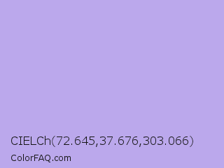 CIELCh 72.645,37.676,303.066 Color is a light indigo color and the nearest color is Biloba Flower #b2a1ea. Hex code #bba8ec and RGB value is rgb(187,168,236). In RGB color space, this color is composed of 73% red, 66% green, 93% blue, In CMYK color space, this color is composed of 21% cyan, 29% magenta, 0% yellow , 7% black , In HSL color space, this color has a hue angle of 257° , 64% saturation and 79% lightness.