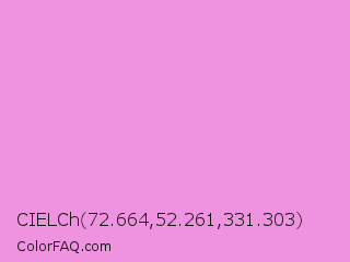 CIELCh 72.664,52.261,331.303 Color is a light magenta color and the nearest color is Lavender Rose #fba0e3. Hex code #ef93e1 and RGB value is rgb(239,147,225). In RGB color space, this color is composed of 94% red, 58% green, 88% blue, In CMYK color space, this color is composed of 0% cyan, 38% magenta, 6% yellow , 6% black , In HSL color space, this color has a hue angle of 309° , 74% saturation and 76% lightness.