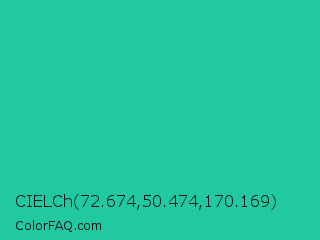 CIELCh 72.674,50.474,170.169 Color is a normal cyan color and the nearest color is Shamrock #33cc99. Hex code #21c9a1 and RGB value is rgb(33,201,161). In RGB color space, this color is composed of 13% red, 79% green, 63% blue, In CMYK color space, this color is composed of 84% cyan, 0% magenta, 20% yellow , 21% black , In HSL color space, this color has a hue angle of 166° , 72% saturation and 46% lightness.