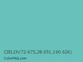 CIELCh 72.675,28.651,190.626 Color is a normal cyan color and the nearest color is Downy #6fd0c5. Hex code #68c1bb and RGB value is rgb(104,193,187). In RGB color space, this color is composed of 41% red, 76% green, 73% blue, In CMYK color space, this color is composed of 46% cyan, 0% magenta, 3% yellow , 24% black , In HSL color space, this color has a hue angle of 176° , 42% saturation and 58% lightness.