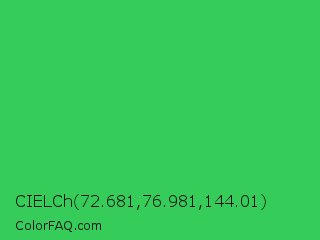 CIELCh 72.681,76.981,144.01 Color is a normal green color and the nearest color is UFO Green #3cd070. Hex code #35cc5a and RGB value is rgb(53,204,90). In RGB color space, this color is composed of 21% red, 80% green, 35% blue, In CMYK color space, this color is composed of 74% cyan, 0% magenta, 56% yellow , 20% black , In HSL color space, this color has a hue angle of 135° , 60% saturation and 50% lightness.
