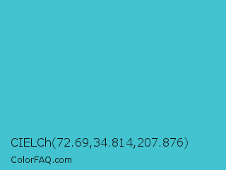 CIELCh 72.69,34.814,207.876 Color is a normal cyan color and the nearest color is Sea Serpent #4bc7cf. Hex code #42c3cf and RGB value is rgb(66,195,207). In RGB color space, this color is composed of 26% red, 76% green, 81% blue, In CMYK color space, this color is composed of 68% cyan, 6% magenta, 0% yellow , 19% black , In HSL color space, this color has a hue angle of 185° , 59% saturation and 54% lightness.