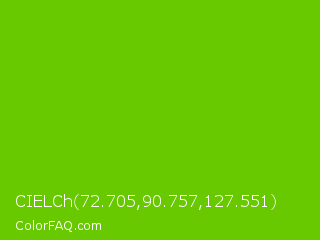 CIELCh 72.705,90.757,127.551 Color is a normal green color and the nearest color is Lima #76bd17. Hex code #68c900 and RGB value is rgb(104,201,0). In RGB color space, this color is composed of 41% red, 79% green, 0% blue, In CMYK color space, this color is composed of 48% cyan, 0% magenta, 100% yellow , 21% black , In HSL color space, this color has a hue angle of 89° , 100% saturation and 39% lightness.