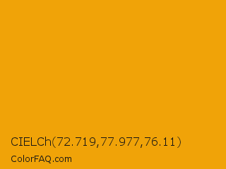 CIELCh 72.719,77.977,76.11 Color is a normal orange color and the nearest color is Yellow Sea #fea904. Hex code #f0a308 and RGB value is rgb(240,163,8). In RGB color space, this color is composed of 94% red, 64% green, 3% blue, In CMYK color space, this color is composed of 0% cyan, 32% magenta, 97% yellow , 6% black , In HSL color space, this color has a hue angle of 40° , 94% saturation and 49% lightness.