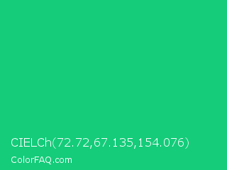 CIELCh 72.72,67.135,154.076 Color is a normal green color and the nearest color is Mountain Meadow Crayola #1ab385. Hex code #14cc7a and RGB value is rgb(20,204,122). In RGB color space, this color is composed of 8% red, 80% green, 48% blue, In CMYK color space, this color is composed of 90% cyan, 0% magenta, 40% yellow , 20% black , In HSL color space, this color has a hue angle of 153° , 82% saturation and 44% lightness.