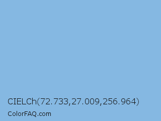 CIELCh 72.733,27.009,256.964 Color is a light blue color and the nearest color is Aero #7cb9e8. Hex code #85b8e2 and RGB value is rgb(133,184,226). In RGB color space, this color is composed of 52% red, 72% green, 89% blue, In CMYK color space, this color is composed of 41% cyan, 19% magenta, 0% yellow , 11% black , In HSL color space, this color has a hue angle of 207° , 62% saturation and 70% lightness.