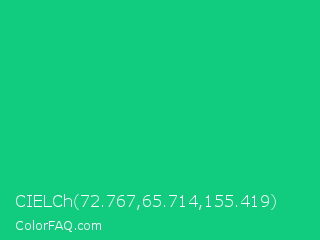 CIELCh 72.767,65.714,155.419 Color is a normal green color and the nearest color is Mountain Meadow Crayola #1ab385. Hex code #11cc7e and RGB value is rgb(17,204,126). In RGB color space, this color is composed of 7% red, 80% green, 49% blue, In CMYK color space, this color is composed of 92% cyan, 0% magenta, 38% yellow , 20% black , In HSL color space, this color has a hue angle of 155° , 85% saturation and 43% lightness.