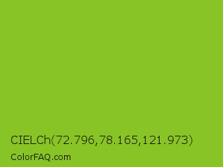 CIELCh 72.796,78.165,121.973 Color is a normal green color and the nearest color is Atlantis #97cd2d. Hex code #88c426 and RGB value is rgb(136,196,38). In RGB color space, this color is composed of 53% red, 77% green, 15% blue, In CMYK color space, this color is composed of 31% cyan, 0% magenta, 81% yellow , 23% black , In HSL color space, this color has a hue angle of 83° , 68% saturation and 46% lightness.