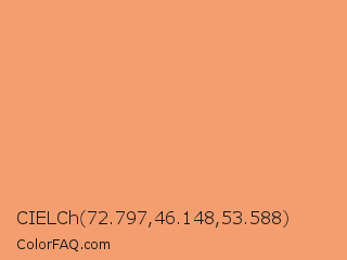CIELCh 72.797,46.148,53.588 Color is a light orange color and the nearest color is Apricot #eb9373. Hex code #f49e70 and RGB value is rgb(244,158,112). In RGB color space, this color is composed of 96% red, 62% green, 44% blue, In CMYK color space, this color is composed of 0% cyan, 35% magenta, 54% yellow , 4% black , In HSL color space, this color has a hue angle of 21° , 86% saturation and 70% lightness.
