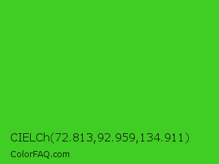 CIELCh 72.813,92.959,134.911 Color is a normal green color and the nearest color is Harlequin Green #46cb18. Hex code #40cd24 and RGB value is rgb(64,205,36). In RGB color space, this color is composed of 25% red, 80% green, 14% blue, In CMYK color space, this color is composed of 69% cyan, 0% magenta, 82% yellow , 20% black , In HSL color space, this color has a hue angle of 110° , 70% saturation and 47% lightness.