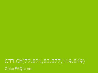 CIELCh 72.821,83.377,119.849 Color is a normal lime color and the nearest color is Apple Green #8db600. Hex code #8ac404 and RGB value is rgb(138,196,4). In RGB color space, this color is composed of 54% red, 77% green, 2% blue, In CMYK color space, this color is composed of 30% cyan, 0% magenta, 98% yellow , 23% black , In HSL color space, this color has a hue angle of 78° , 96% saturation and 39% lightness.