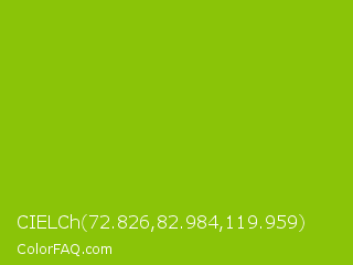 CIELCh 72.826,82.984,119.959 Color is a normal lime color and the nearest color is Apple Green #8db600. Hex code #8ac408 and RGB value is rgb(138,196,8). In RGB color space, this color is composed of 54% red, 77% green, 3% blue, In CMYK color space, this color is composed of 30% cyan, 0% magenta, 96% yellow , 23% black , In HSL color space, this color has a hue angle of 79° , 92% saturation and 40% lightness.