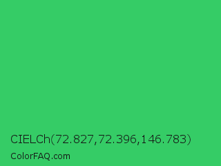 CIELCh 72.827,72.396,146.783 Color is a normal green color and the nearest color is UFO Green #3cd070. Hex code #35cc66 and RGB value is rgb(53,204,102). In RGB color space, this color is composed of 21% red, 80% green, 40% blue, In CMYK color space, this color is composed of 74% cyan, 0% magenta, 50% yellow , 20% black , In HSL color space, this color has a hue angle of 139° , 60% saturation and 50% lightness.