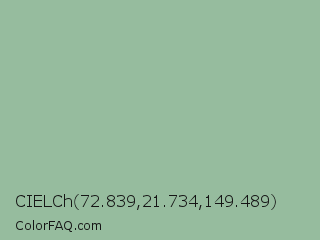 CIELCh 72.839,21.734,149.489 Color is a light green color and the nearest color is Eton Blue #96c8a2. Hex code #96bc9e and RGB value is rgb(150,188,158). In RGB color space, this color is composed of 59% red, 74% green, 62% blue, In CMYK color space, this color is composed of 20% cyan, 0% magenta, 16% yellow , 26% black , In HSL color space, this color has a hue angle of 133° , 22% saturation and 66% lightness.
