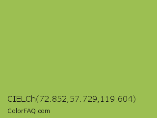 CIELCh 72.852,57.729,119.604 Color is a normal lime color and the nearest color is Middle Green Yellow #acbf60. Hex code #9cbf52 and RGB value is rgb(156,191,82). In RGB color space, this color is composed of 61% red, 75% green, 32% blue, In CMYK color space, this color is composed of 18% cyan, 0% magenta, 57% yellow , 25% black , In HSL color space, this color has a hue angle of 79° , 46% saturation and 54% lightness.