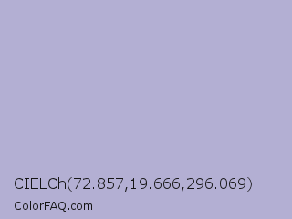 CIELCh 72.857,19.666,296.069 Color is a light indigo color and the nearest color is Logan #aaa9cd. Hex code #b3afd3 and RGB value is rgb(179,175,211). In RGB color space, this color is composed of 70% red, 69% green, 83% blue, In CMYK color space, this color is composed of 15% cyan, 17% magenta, 0% yellow , 17% black , In HSL color space, this color has a hue angle of 247° , 29% saturation and 76% lightness.