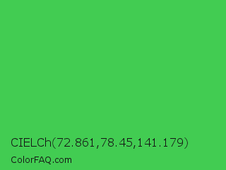 CIELCh 72.861,78.45,141.179 Color is a normal green color and the nearest color is UFO Green #3cd070. Hex code #42cc52 and RGB value is rgb(66,204,82). In RGB color space, this color is composed of 26% red, 80% green, 32% blue, In CMYK color space, this color is composed of 68% cyan, 0% magenta, 60% yellow , 20% black , In HSL color space, this color has a hue angle of 127° , 58% saturation and 53% lightness.