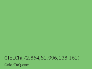 CIELCh 72.864,51.996,138.161 Color is a light green color and the nearest color is Mantis #74c365. Hex code #7cc471 and RGB value is rgb(124,196,113). In RGB color space, this color is composed of 49% red, 77% green, 44% blue, In CMYK color space, this color is composed of 37% cyan, 0% magenta, 42% yellow , 23% black , In HSL color space, this color has a hue angle of 112° , 41% saturation and 61% lightness.