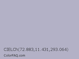 CIELCh 72.883,11.431,293.064 Color is a light indigo color and the nearest color is Cadet Blue #a9b2c3. Hex code #b2b1c6 and RGB value is rgb(178,177,198). In RGB color space, this color is composed of 70% red, 69% green, 78% blue, In CMYK color space, this color is composed of 10% cyan, 11% magenta, 0% yellow , 22% black , In HSL color space, this color has a hue angle of 243° , 16% saturation and 74% lightness.