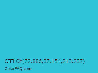 CIELCh 72.886,37.154,213.237 Color is a normal cyan color and the nearest color is Scooter #2ebfd4. Hex code #2fc4d7 and RGB value is rgb(47,196,215). In RGB color space, this color is composed of 18% red, 77% green, 84% blue, In CMYK color space, this color is composed of 78% cyan, 9% magenta, 0% yellow , 16% black , In HSL color space, this color has a hue angle of 187° , 68% saturation and 51% lightness.