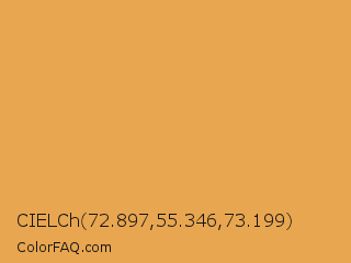 CIELCh 72.897,55.346,73.199 Color is a light orange color and the nearest color is Indian Yellow #e3a857. Hex code #e8a650 and RGB value is rgb(232,166,80). In RGB color space, this color is composed of 91% red, 65% green, 31% blue, In CMYK color space, this color is composed of 0% cyan, 28% magenta, 66% yellow , 9% black , In HSL color space, this color has a hue angle of 34° , 77% saturation and 61% lightness.