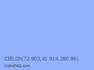 CIELCh 72.903,41.914,280.86 Color is a light blue color and the nearest color is Jordy Blue #8ab9f1. Hex code #91b2fe and RGB value is rgb(145,178,254). In RGB color space, this color is composed of 57% red, 70% green, 100% blue, In CMYK color space, this color is composed of 43% cyan, 30% magenta, 0% yellow , 0% black , In HSL color space, this color has a hue angle of 222° , 98% saturation and 78% lightness.