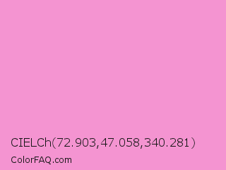 CIELCh 72.903,47.058,340.281 Color is a light magenta color and the nearest color is Pale Magenta Pink #ff99cc. Hex code #f494d1 and RGB value is rgb(244,148,209). In RGB color space, this color is composed of 96% red, 58% green, 82% blue, In CMYK color space, this color is composed of 0% cyan, 39% magenta, 14% yellow , 4% black , In HSL color space, this color has a hue angle of 322° , 81% saturation and 77% lightness.