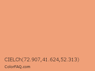 CIELCh 72.907,41.624,52.313 Color is a light orange color and the nearest color is Dark Salmon #e9967a. Hex code #f0a078 and RGB value is rgb(240,160,120). In RGB color space, this color is composed of 94% red, 63% green, 47% blue, In CMYK color space, this color is composed of 0% cyan, 33% magenta, 50% yellow , 6% black , In HSL color space, this color has a hue angle of 20° , 80% saturation and 71% lightness.